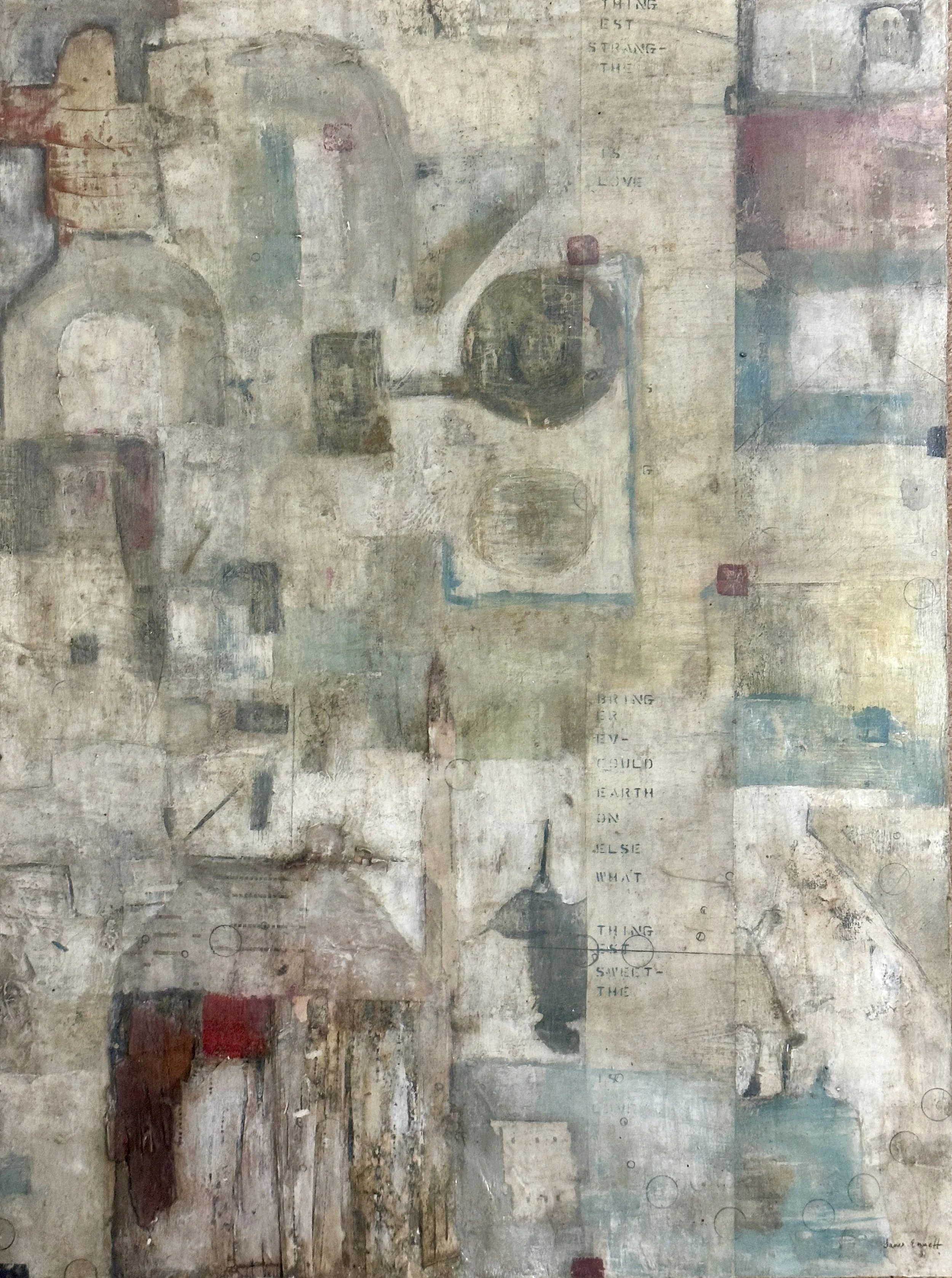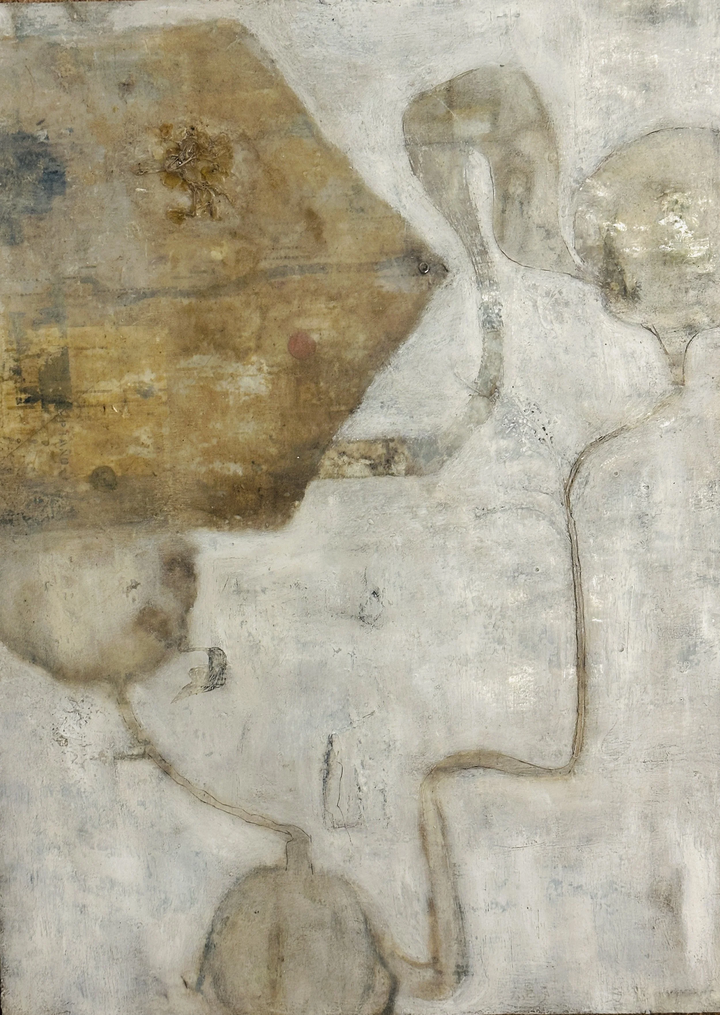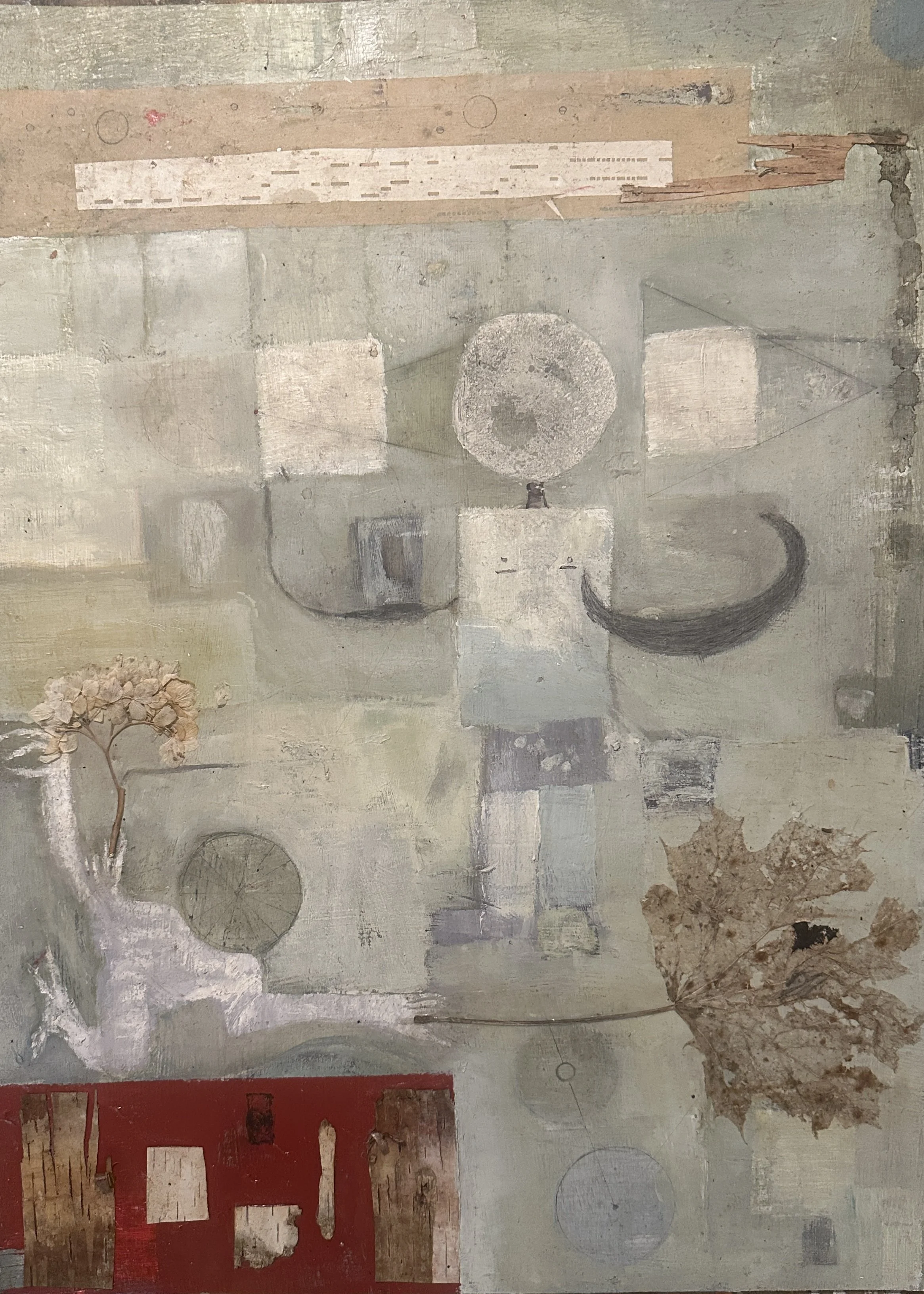 acrylic, dry pigment, wax penciil, birch bark, player piano paper, coffee, coffee grinds