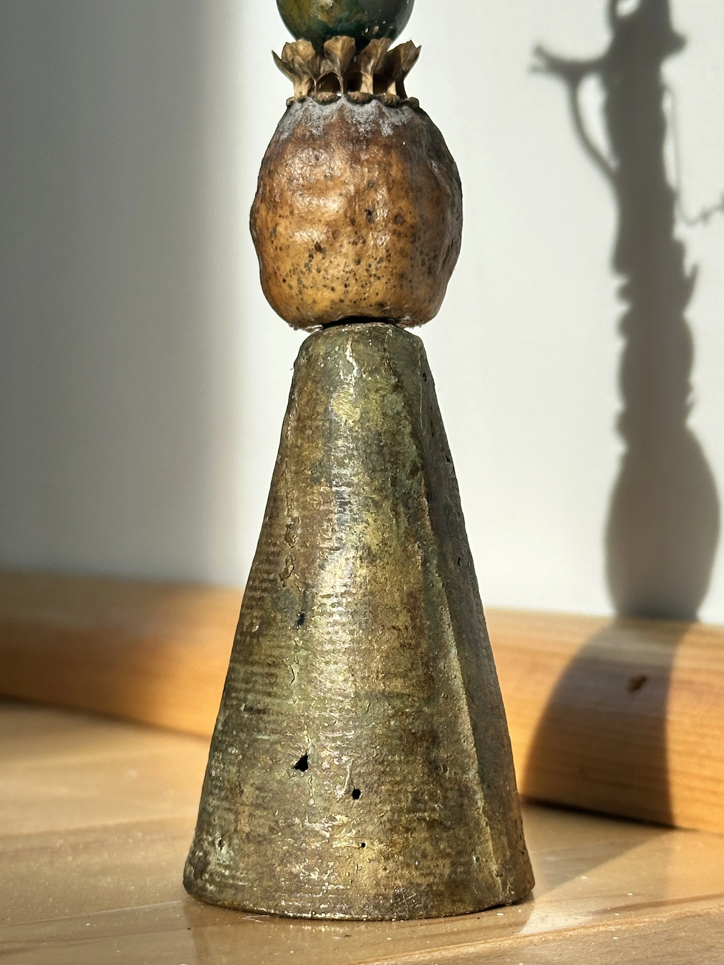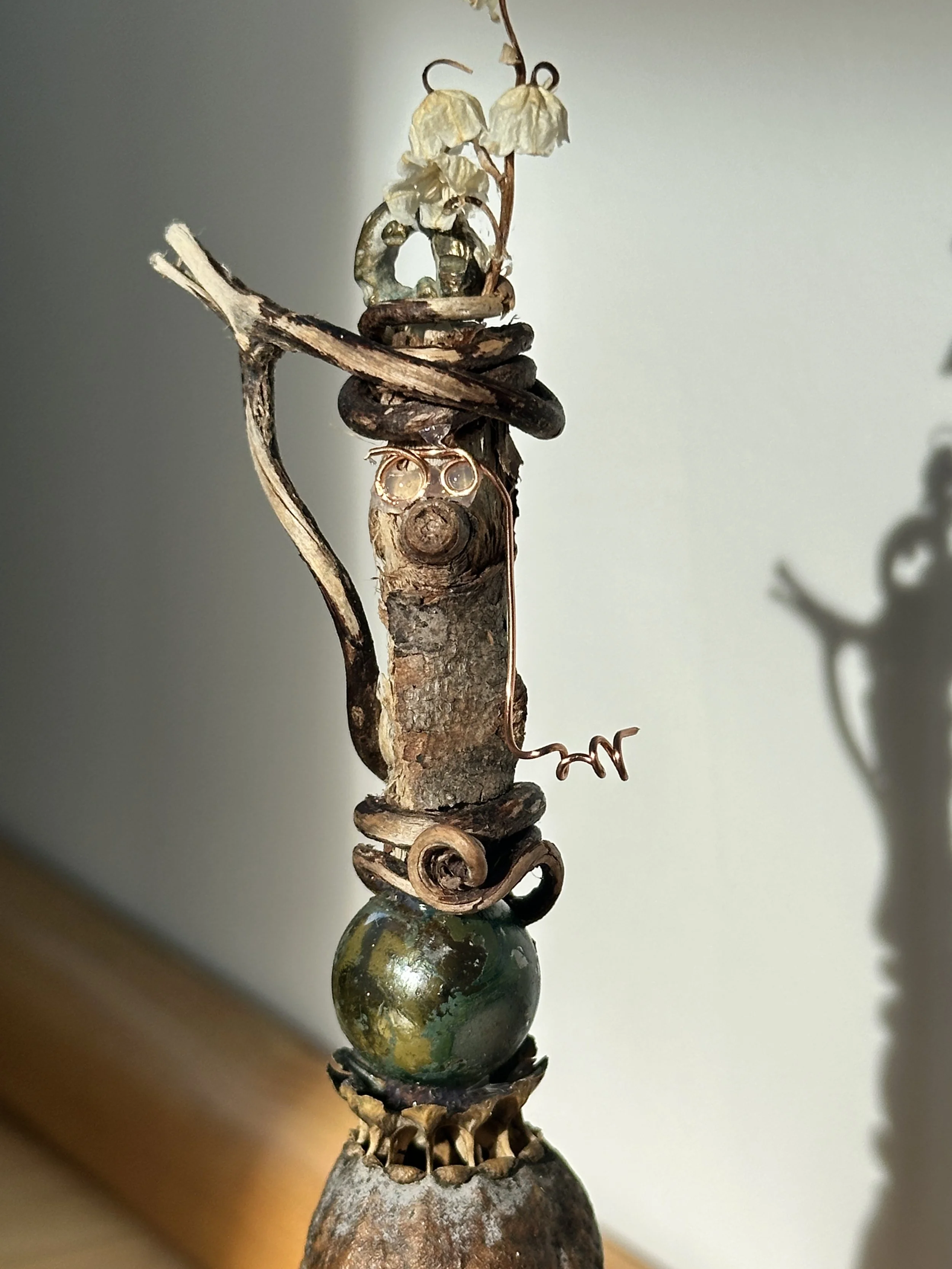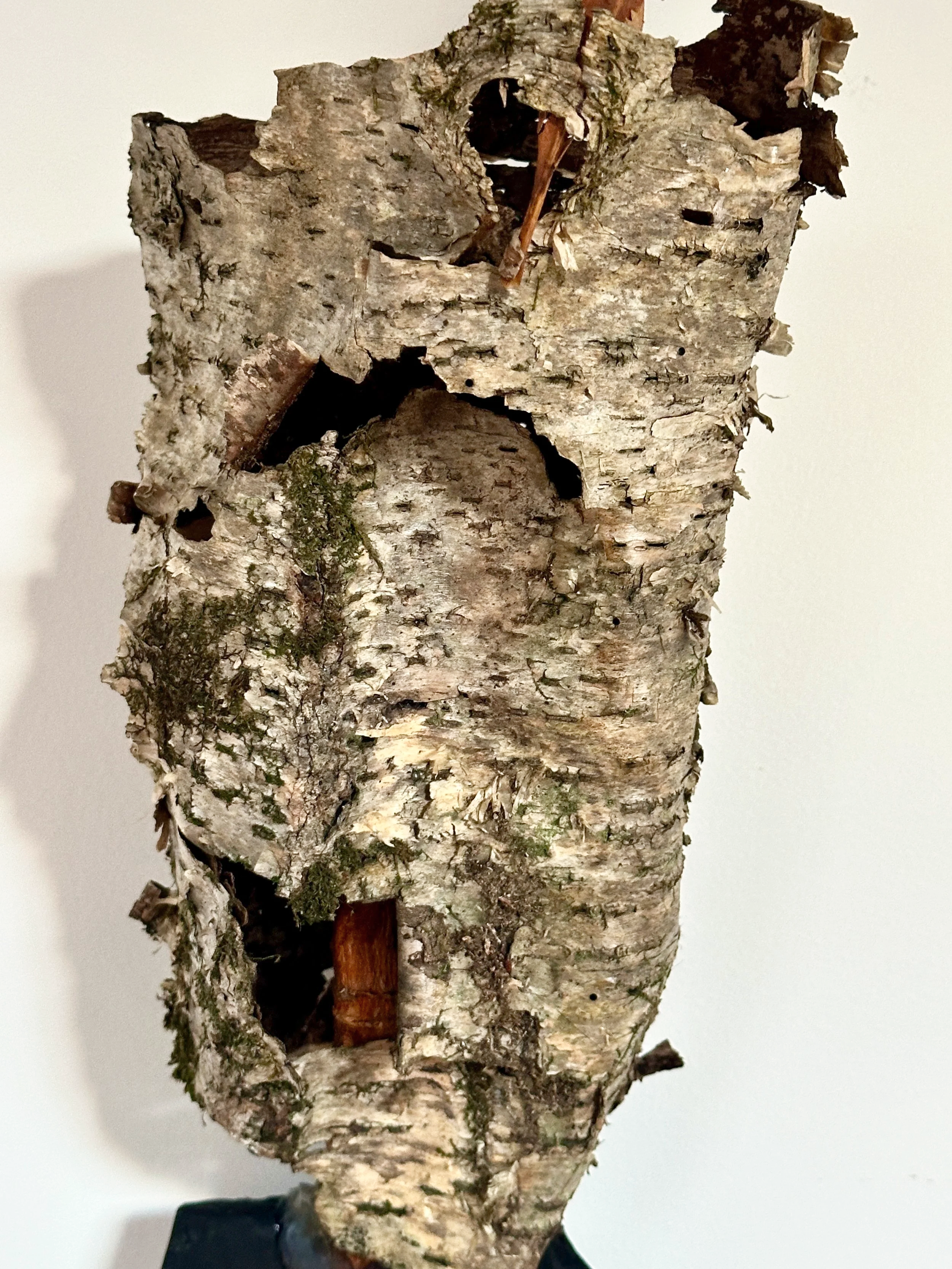 found wood, fired cedar, antique bells, copper wire, found birch bark, found leaf
