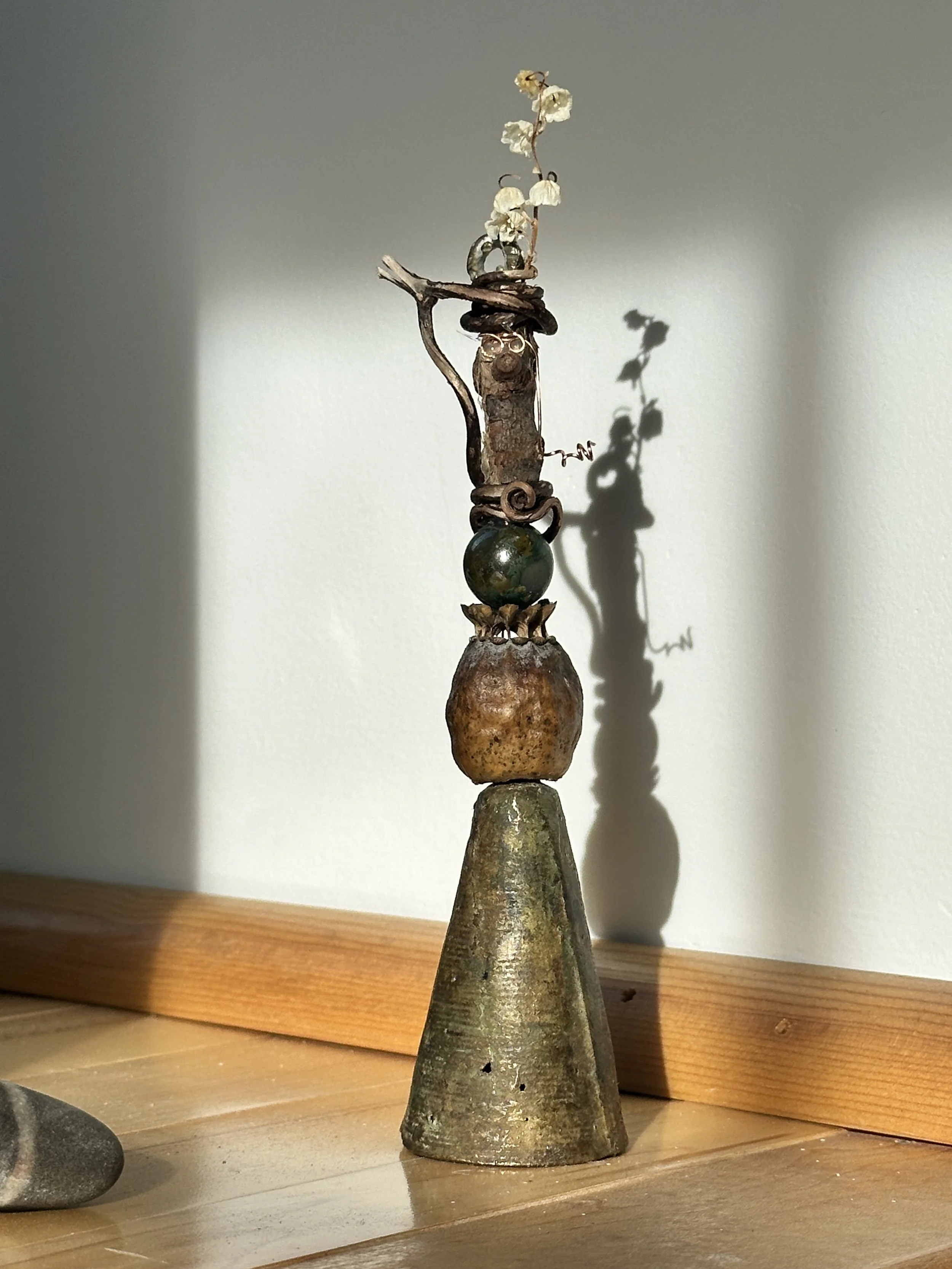 found wood, deconstructed bell, found flowers, marble, copper wire
